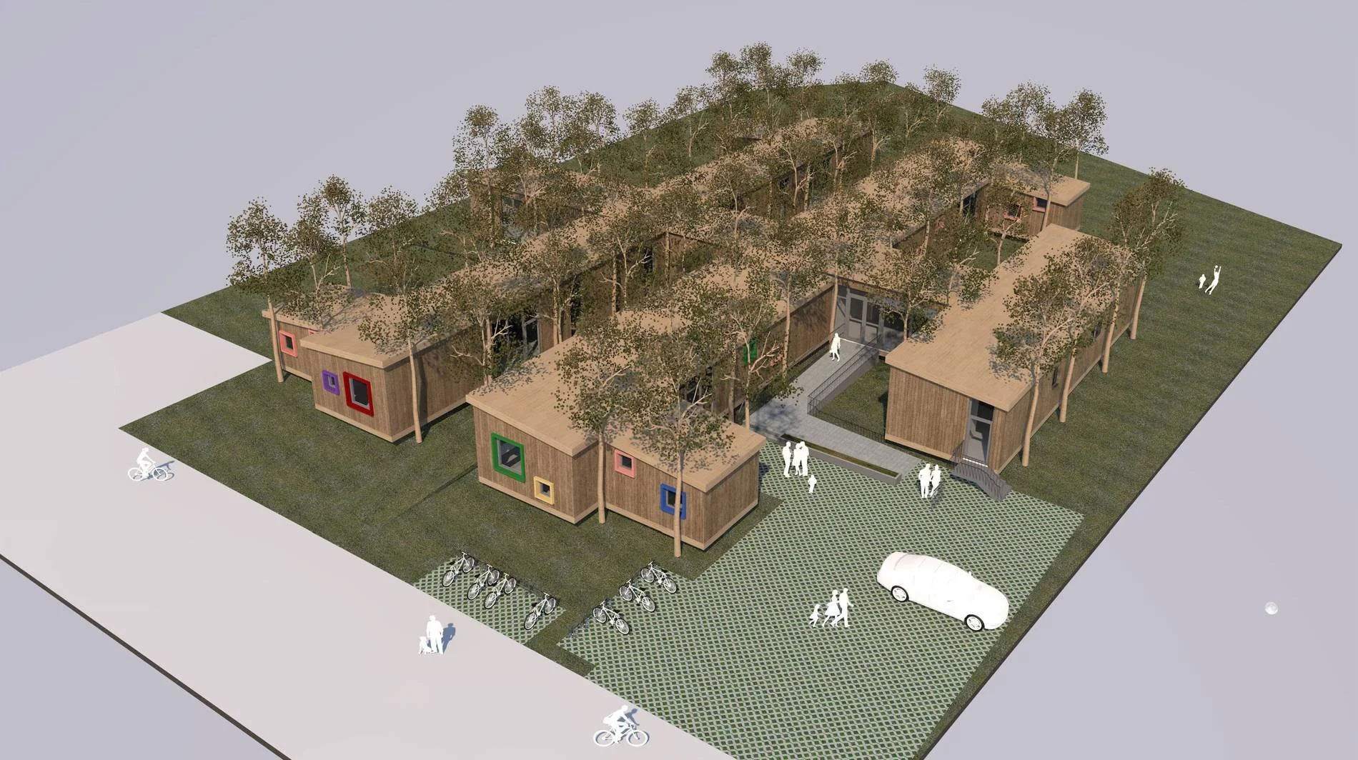 Mehrere eingeschossige Baukörper in Holzbauweise werden so in den vorhandenen Baumbestand integriert, dass sie sich visuell und konstruktiv vom Boden lösen. Bestehende Bäume werden nicht als Hindernis betrachtet, sondern als Teil der räumlichen und strukturellen Logik.